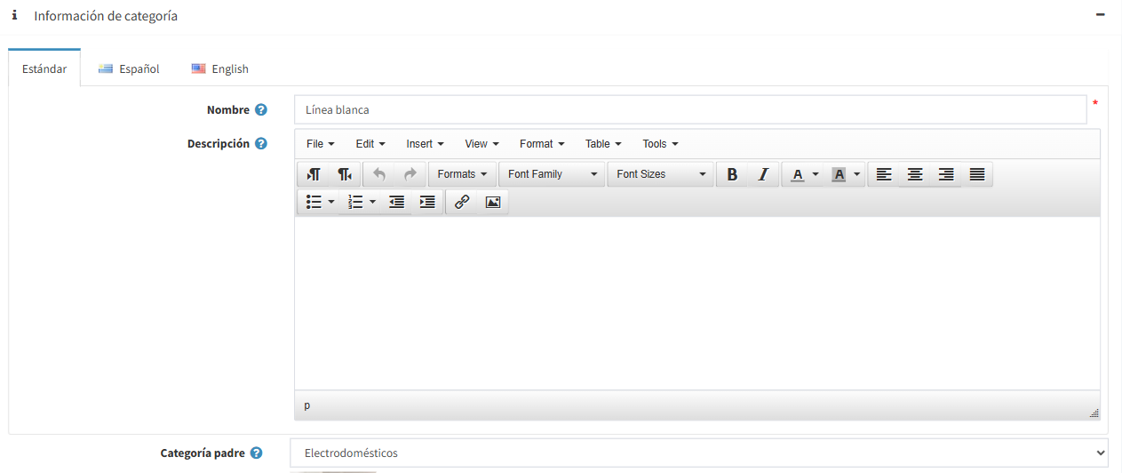 - En el campo Categoría padre, elige la categoría principal.